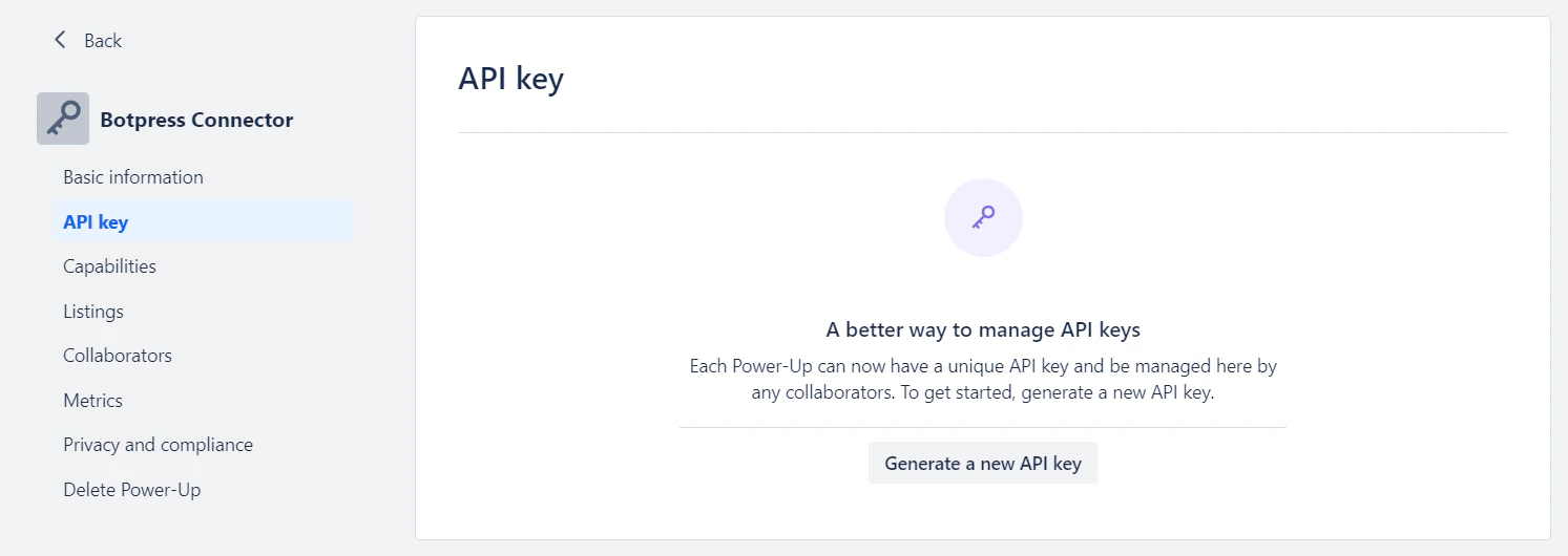 - Once the Power-Up is created, you will be redirected to API Key settings page, displayed below. Generate a new API key, then copy and paste this key into the API Key field in Botpress.